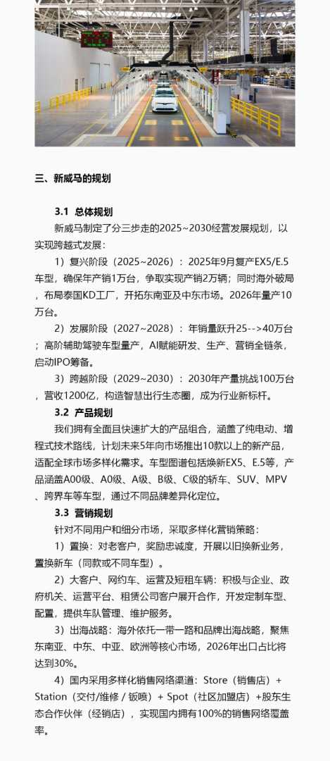 威马汽车重整投资人发布白皮书,计划2025年9月复产EX5和E5车型,并公布供应商欠款清偿方案。同时制定2025-2030年发展规划,包括产能扩张、市场拓展及IPO筹备,初期投资10亿元用于设备升级和产品开发。