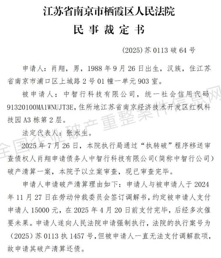 日前,江苏省南京市栖霞区人民法院裁定受理对中智行的破产清算申请。据法院发布的民事裁定书,申请人对中智行申请破产清算理由如下:申请人与中智行于2024年11月27日在劳动仲裁委员会签订调解书,约定中智行在2025年4月20日前支付1.5万元,后经多次催要未果。申请人遂向人民法院申请强制执行,但中智行一直无法支付调解款项,故申请其破产清算还债。