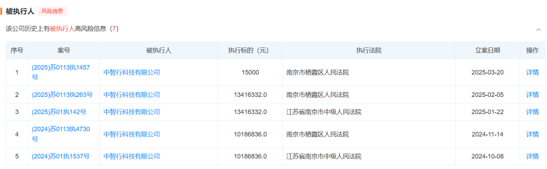 从2024年10月开始,中智行多次成为被执行人,历史被执行总金额达4732.8万元;两起终本案件的执行标的总金额为2360.3万元,其中未履行金额2192.8万元。