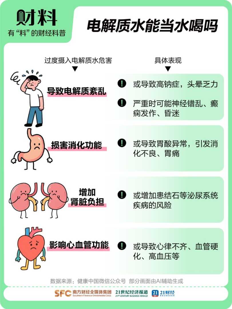 不过,专家提醒,卖爆了的电解质水并不能当水喝。市场上的电解质水含糖量通常在6—10克/100毫升,那么一瓶500毫升的电解质水,最高含糖量可高达50克,约等于11块方糖,过量摄入对健康不利。除了糖分,过量摄入电解质也对身体有害,消费者应理性选择。