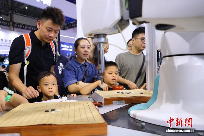 9月6日,在重庆举行的2025世界智能产业博览会上,一台机器人正在与小朋友下五子棋。梁钦卿摄