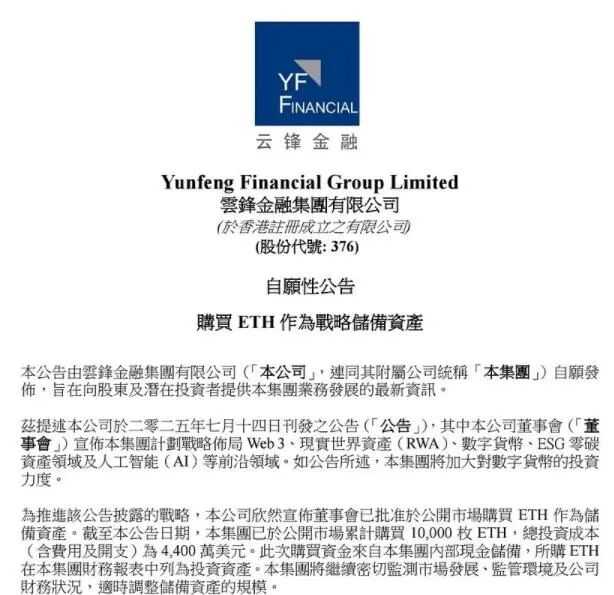 云锋金融布局数字资产,ETH储备与Web3领域拓展并行