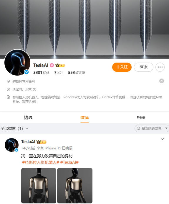 9月7日,特斯拉开通名为“TeslaAI”的官方微博,认证为“特斯拉官方账号”。该账号专注于介绍特斯拉的AI创新成果,账号简介中明确指出,该账号主要用于介绍“特斯拉人形机器人、智能辅助驾驶、Robotaxi无人驾驶网约车、Cortex计算集群”等前沿AI产品,展现了特斯拉在科技领域的持续探索。