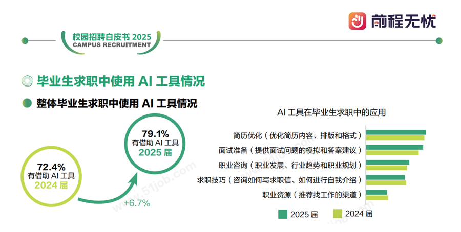不少同学以为“撒网式投递简历”能提高成功率,然而事实并非如此。此前发布的《前程无忧校园招聘白皮书2025》数据显示,应届毕业生意向就业行业前三分别为IT互联网/电子商务、电子技术/半导体/集成电路、通信/电信/网络设备,这些热门行业集中度极高,导致简历竞争愈发激烈。例如,计算机类岗位平均每个岗位收到的简历数量可高达数百份。若盲目跟风,不仅难以脱颖而出,反而可能被淹没在简历海中。前程无忧建议毕业生精准定位匹配自身专业背景与能力的岗位,并深度研究目标公司的岗位描述,针对性优化简历与求职信内容。同时,可以利用AI辅助工具进行简历匹配优化。在2025届校园招聘中,79.1%的应届毕业生采用了人工智能(AI)工具来增强求职竞争力,其中51.3%用于简历优化,48.9%用于面试模拟练习,另有35%和33.3%分别用于获取职业咨询和求职技巧。