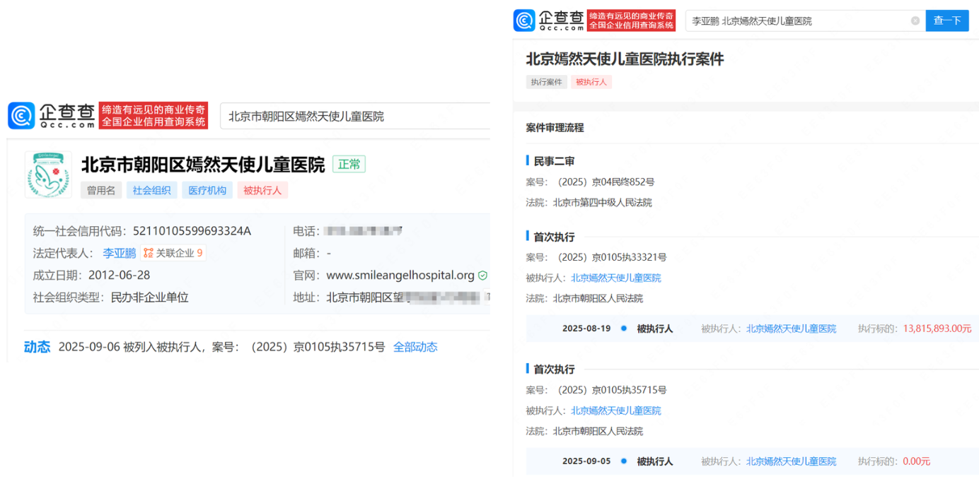 企查查APP显示,近日,李亚鹏担任法定代表人的北京朝阳区嫣然天使儿童医院(曾用名:北京嫣然天使儿童医院)被列入被执行人,执行法院为北京市朝阳区人民法院,这一司法动态引发了广泛关注。据财经聚焦,企业的司法风险往往与其经营状况密切相关。