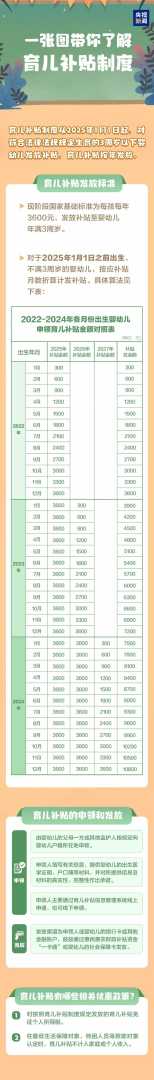 据了解,从2025年1月1日起,对符合法律法规规定生育的3周岁以下婴幼儿发放补贴,至其年满3周岁。育儿补贴按年发放,现阶段国家基础标准为每孩每年3600元。这一标准既考虑了家庭的实际需求,也体现了政策的公平性和可持续性。