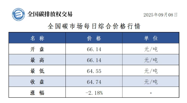 新华财经北京9月8日电据微信公众号“全国碳交易”消息,今日全国碳市场综合价格行情为:开盘价66.14元/吨,最高价66.14元/吨,最低价64.55元/吨,收盘价64.74元/吨,收盘价较前一日下跌2.18%,碳市场行情波动引发关注。作为碳市场交易的重要指标,综合价格行情的变动直接反映了市场供需关系的变化。