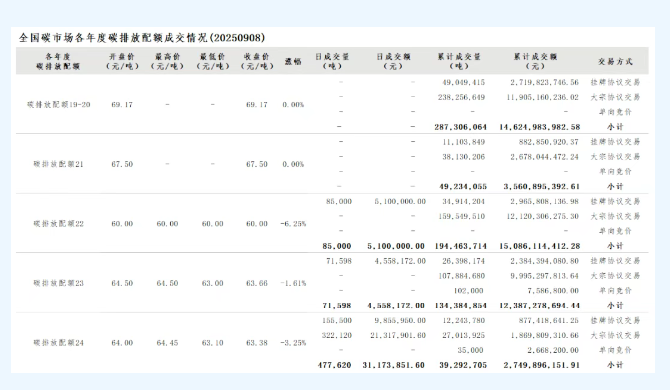 截至2025年9月8日,全国碳市场碳排放配额累计成交量704,681,392吨,累计成交额48,409,168,633.82元。累计成交量和成交额的持续增长,充分显示了碳市场在我国经济发展中的重要地位。