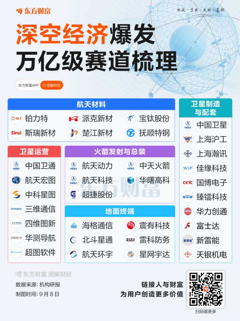 周一深空经济概念爆发,创远信科涨超15%(深空经济概念股),震有科技涨超10%,三维通信、中国卫星、上海沪工等涨停,航天宏图涨超9%,华力创通、中国卫通等强势跟涨,深空经济成为市场新宠。