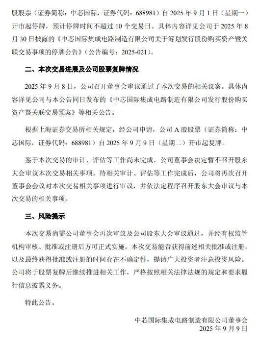 中芯国际拟向国家集成电路产业投资基金等发行股份购买中芯北方49%股权,股票9月1日停牌,预计停牌不超10个交易日,9月9日起复牌,交易完成后持股比例升至100%。