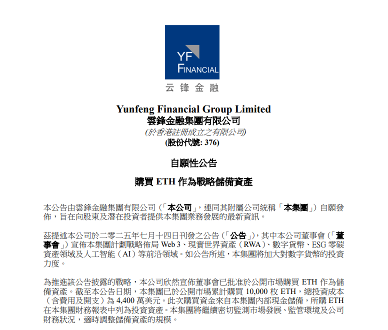云锋金融公告购入1万枚ETH作为储备资产,总投资4400万美元。此举旨在配合集团布局Web3、现实世界资产代币化等前沿领域,并探索ETH在保险业务中的应用。公司计划将更多主流数字资产纳入战略储备。