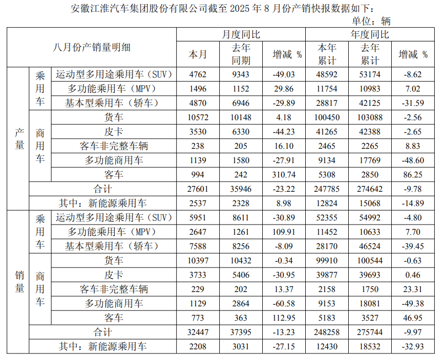 江淮汽车2025年8月产销数据:产量销量双降,新能源表现承压