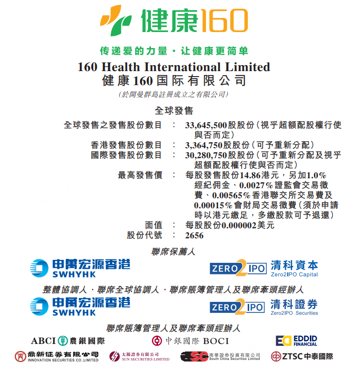 健康160国际有限公司(临时代码)(02656)于2025年9月9 - 12日招股,拟全球发售3364.55万股。其为医药健康用品批发商及数字医疗综合服务提供商,业绩稳定增长,所得款项将用于多方面发展。