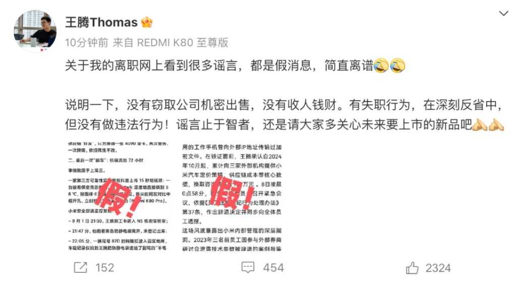 9月9日,王腾发布微博澄清离职谣言称:“关于我的离职网上看到很多谣言,都是假消息,简直离谱。说明一下,没有窃取公司机密出售,没有收人钱财。小米高管有失职行为,在深刻反省中,但没有做违法行为!谣言止于智者,还是请大家多关心未来要上市的新品吧。”