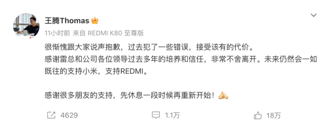 当日晚间,王腾在其微博账号上发文称:“很惭愧跟大家说声抱歉,过去犯了一些错误,接受该有的代价。感谢雷总和公司各位领导过去多年的培养和信任,非常不舍离开。未来仍然会一如既往的支持小米,支持REDMI。”同时,他还在文中透露会先休息一段时间再重新开始。