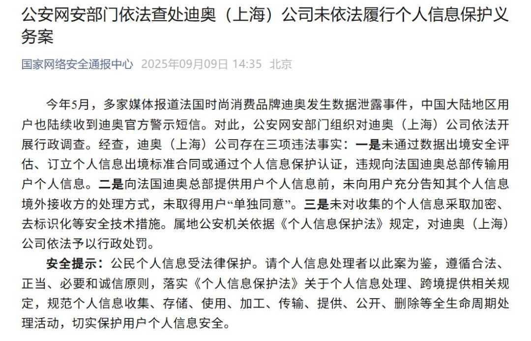 今年5月,法国时尚品牌迪奥发生数据泄露事件,中国大陆用户收到警示短信。经查,迪奥(上海)公司存在违规传输用户信息等三项违法事实,已被依法行政处罚。迪奥已启动调查并加强系统安全。