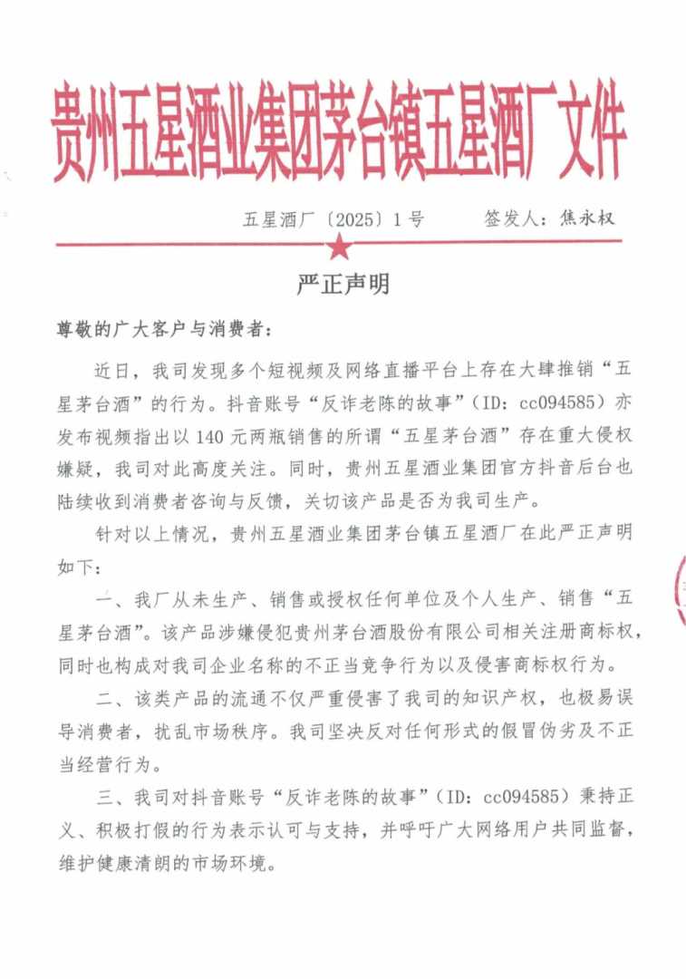 9月9日,贵州五星酒业集团茅台镇五星酒厂发布重要声明称,近日,公司发现多个短视频及网络直播平台上存在大肆推销“五星茅台酒”的侵权行为,此行为严重扰乱了市场秩序。抖音账号“反诈老陈的故事”亦发布视频指出,以140元两瓶销售的所谓“五星茅台酒”存在重大侵权嫌疑,公司对此高度关注,并表示将坚决维护自身权益。五星酒业强调,公司从未生产、销售或授权任何单位及个人生产、销售“五星茅台酒”,此举旨在保护消费者免受假冒伪劣产品的侵害。