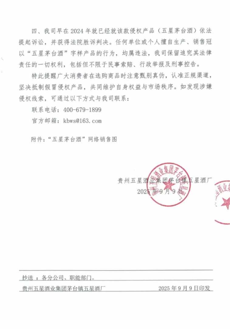 9月9日,贵州五星酒业集团发布声明,指出多个平台存在推销“五星茅台酒”的侵权行为。公司从未生产、销售或授权此产品,已就该侵权产品提起诉讼并获得胜诉。任何擅自生产、销售“五星茅台酒”的行为均属违法,公司将追究法律责任。