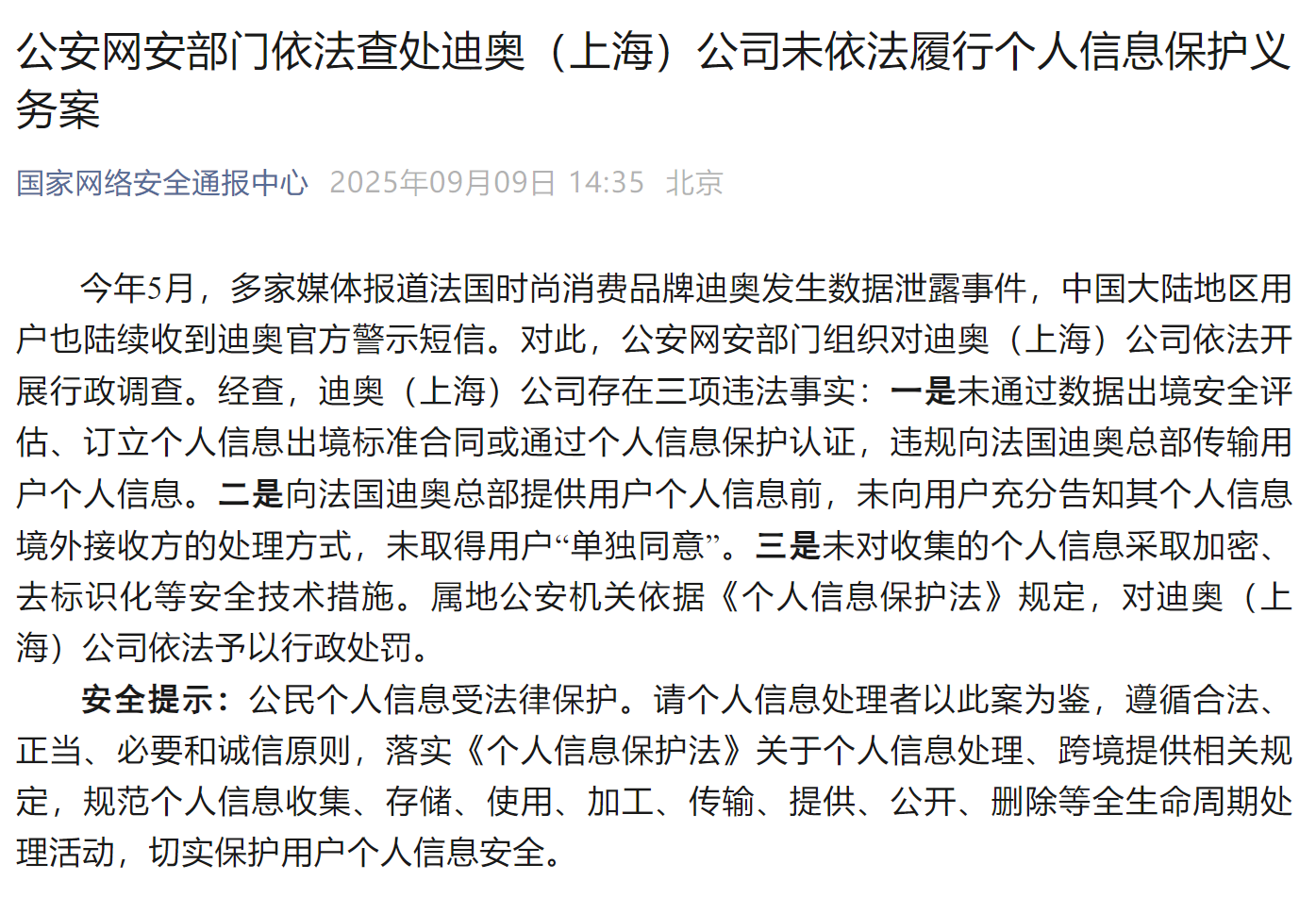 9月9日,国家网络安全通报中心发布通报,法国时尚品牌迪奥发生数据泄露事件,中国大陆用户收到警示。经查,迪奥(上海)公司存在违规传输用户信息等三项违法事实,已被行政处罚。事件凸显个人信息保护重要性。