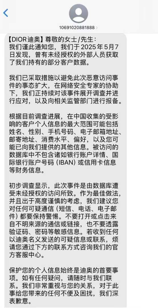 初步调查显示,此次事件是由数据库遭受未经授权的访问所致。迪奥建议客户对任何可疑通信(短信、电话、电子邮件)都要保持警惕。不要打开或点击来自不明来源的通信或链接,也不要透露验证码、密码等敏感信息。若收到任何以迪奥名义发送的可疑信息或联系,请客户咨询迪奥官方客服中心。