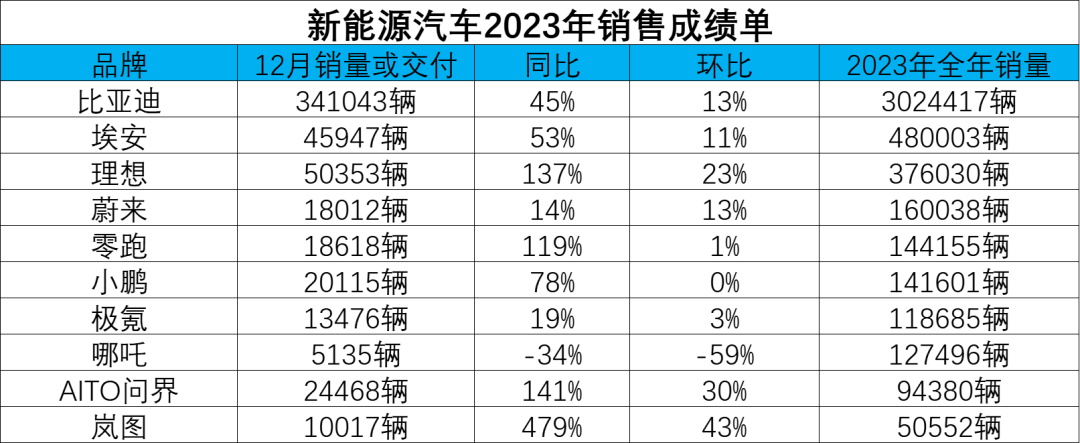 埃安和理想汽车形成第二梯队。埃安全年销量48万辆出头,同比增长77%,但未能达到年初定下的50万辆目标。理想汽车则凭借单月交付5.04万辆的亮眼成绩,成为新势力车企中的佼佼者,全年累计交付37.6万辆,同比增长182.2%。