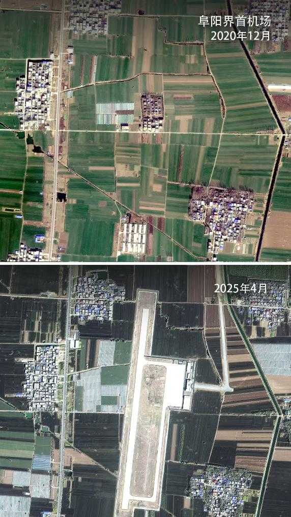 遥感卫星拍摄下阜阳界首机场从无到有的建设过程。新华社发