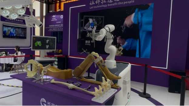 机器人在医疗领域的应用也在逐渐拓展,智能手术室引领行业变革。本届服贸会上,北京长木谷医疗科技股份有限公司带来了数智骨科手术室。“长木谷数智骨科手术室是全球首个集合人工智能与机器人系统于一体的骨科全生命周期管理的智能手术室,构建了数据管理—智能规划—精准执行—动态评估—5G远程的完整骨科诊疗闭环。”长木谷工作人员曾惠彩介绍。