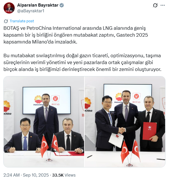 土耳其能源和自然资源部部长阿尔帕斯兰·巴伊拉克塔尔9月9日在社交媒体平台X发文称,土耳其国有能源公司BOTA同中国石油国际事业有限公司签署液化天然气合作谅解备忘录,这标志着双方将在液化天然气(LNG)领域开展全面战略合作。此次合作不仅涉及LNG贸易,还将推动运输流程的优化与高效管理,为能源市场注入新活力。