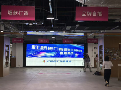 虹桥品汇直播基地内,一台台补光灯、一个个直播间,主播们正忙着直播带货。