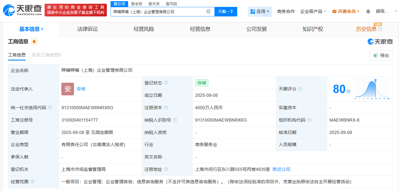 南方财经9月10日电,呷哺呷哺(上海)企业管理有限公司近日成立,注册资本4000万人民币,由呷哺呷哺投资集团全资持股,经营范围广泛。