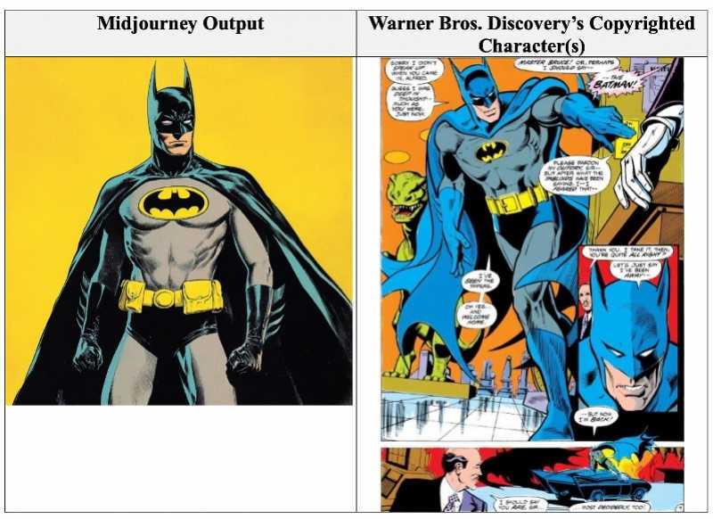 华纳举出了如超人、蝙蝠侠、神奇女侠、闪电侠、小丑、兔八哥、猫和老鼠等多种来自Midjourney的文生图、文生视频案例。例如,输入“蝙蝠侠、20世纪60年代DC漫画”的指令,Midjourney会访问储存在服务器中的华纳兄弟探索频道版权所有作品,生成、公开展示并提供可下载传播的蝙蝠侠输出图像,这一行为明显侵犯了版权。