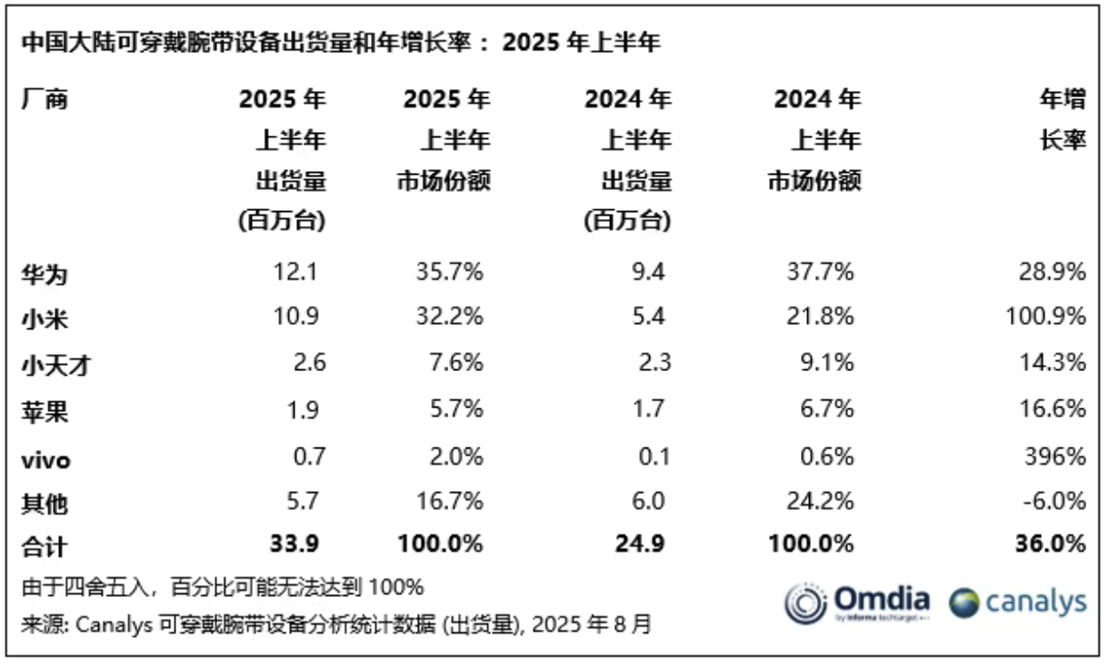 2025年上半年,中国大陆可穿戴腕带设备出货量达3390万台,同比增长36%,创历史新高。华为以1200万台领先,小米1100万台紧随其后,两家均首次上半年突破千万台。