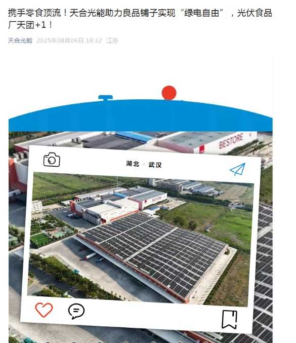 天合光能与良品铺子合作建成5MW分布式光伏项目,采用高功率组件提供绿色电力保障,助力制造业绿色转型,推动'双碳'目标实现。