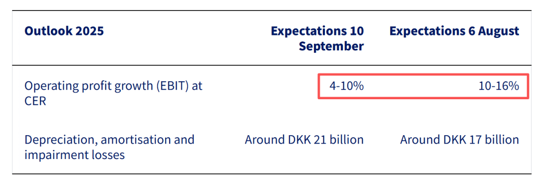 据介绍,此次公司范围内的转型,预计将产生80亿丹麦克朗的一次性重组成本(包括减值费用)。约90亿丹麦克朗的重组成本将在2025年第三季度产生,第四季度将抵消约10亿丹麦克朗。因此,与2025年8月6日发布的营业利润预期相比,诺和诺德预计2025年全年按固定汇率计算(CER)的营业利润增长将受到约6个百分点的负面影响。诺和诺德将2025年营业利润增长预期下调至4%~10%,此前预期为10%~16%。