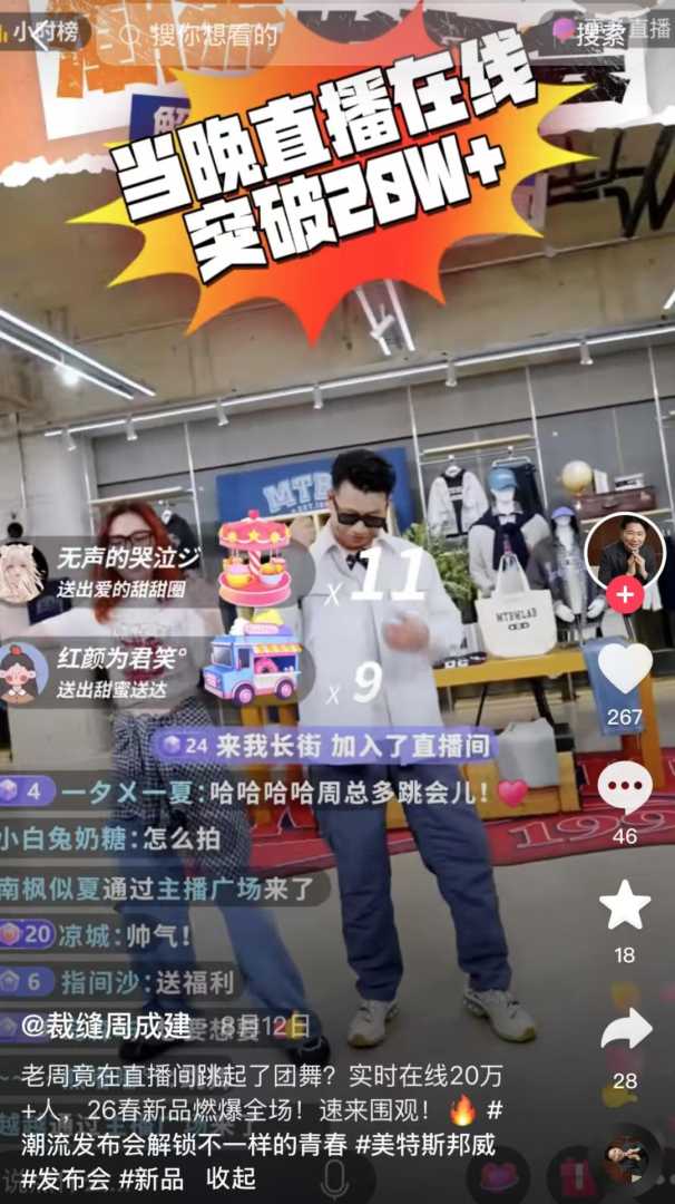 近日,“60岁董事长直播间跳团舞”的视频引爆社交媒体。美特斯邦威创始人、董事长,现年60岁的周成建戴着墨镜,身着白色夹克与藏蓝色运动裤,在直播间大跳团舞,吸引超20万人在线围观,品牌年轻化策略初显成效。