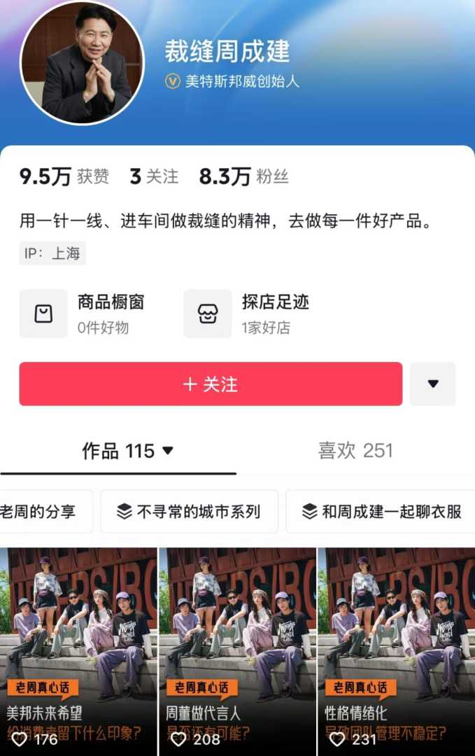 自2024年官宣“新零售5.0转型”以来,周成建频繁活跃于社交媒体,甚至亲自下场直播带货。60岁的周成建表示,美邦未来希望给消费者留下年轻、潮流、适穿、品质兼具性价比的印象。此次跳团舞直播,正是其试图拉近与年轻消费群体距离的尝试。目前,周成建抖音账号发布115条视频,粉丝量8.3万。