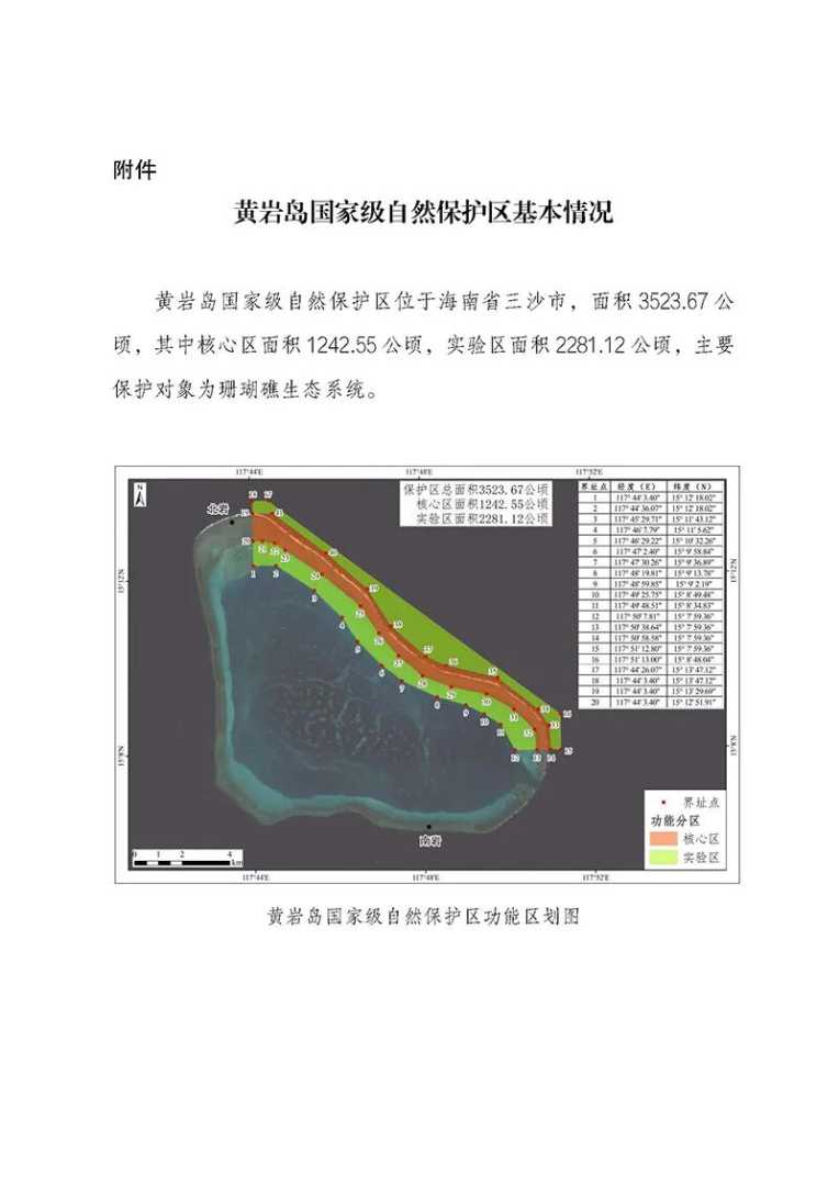 国务院批准新建黄岩岛国家级自然保护区,位于海南三沙市,面积3523.67公顷,核心区1242.55公顷,实验区2281.12公顷,主要保护珊瑚礁生态系统。