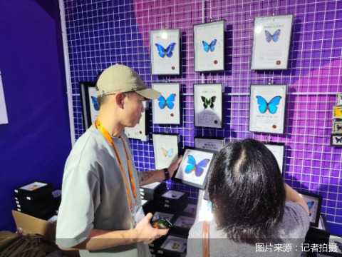 曾以毛绒羊驼火出圈的秘鲁共和国驻华大使馆展位今年也带来了不一样的产品。秘鲁共和国驻华大使馆展位工作人员介绍到,今年不仅带来了新颜色的毛绒羊驼,还推出了蝴蝶标本盲盒。近年来,盲盒产品热度非常高,观众需求较为旺盛。因此今年把盲盒产品带到服贸会,也利用这种模式宣传秘鲁的旅游资源。