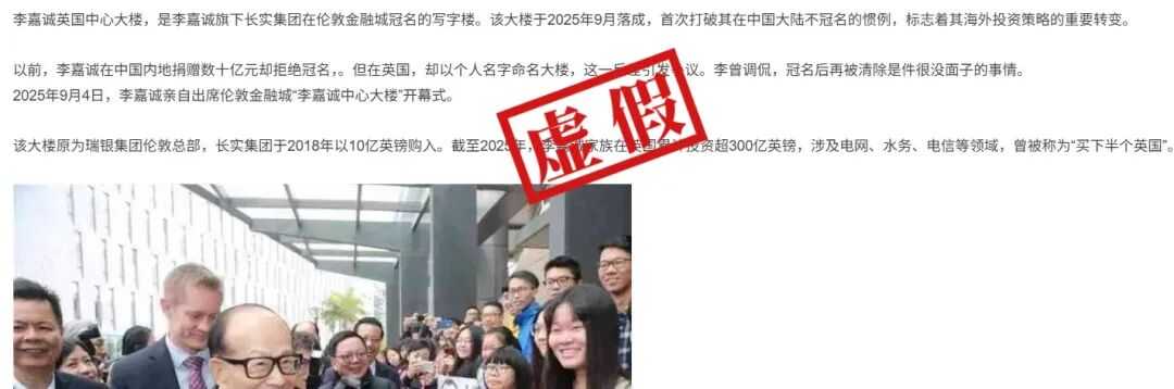 网传李嘉诚出席伦敦大楼开幕式及向乌克兰捐款5亿美元均为虚假消息。实为2017年牛津大学研发中心启用旧图,瑞银伦敦总部大楼已出售,呼吁各界切勿散播谣言。