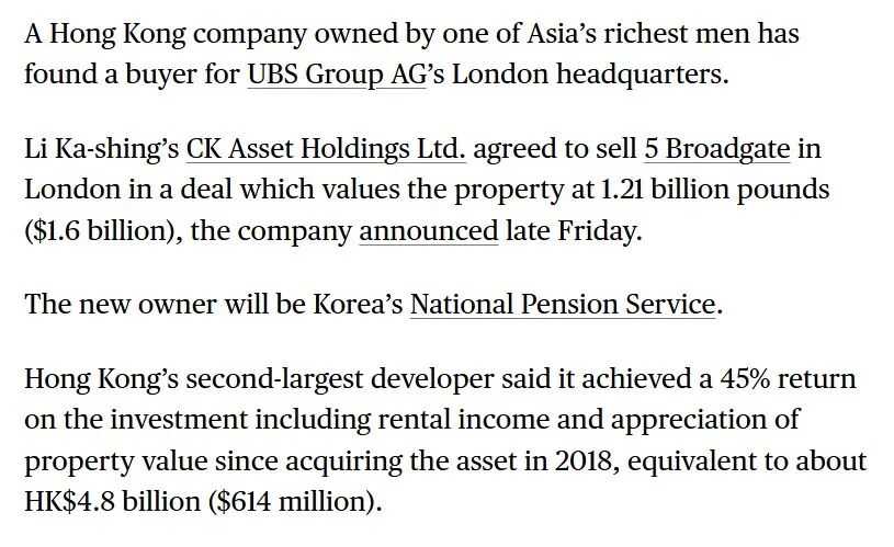 - 网传"瑞银集团总部李嘉诚中心"纯属虚构,长江实业集团2018年收购的瑞银伦敦总部大楼已于2022年出售给韩国国民年金服务局,投资回报率达45%。