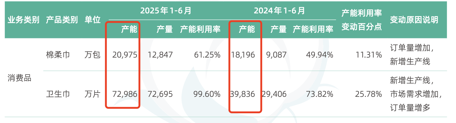 从产能来说,2024年上半年,全棉时代卫生巾业务的产能不到4亿片,而到了2025年则直接超过7亿片,同比涨幅超80%。近年来,稳健医疗的棉柔巾产能利用率均不到50%(2025年上半年为61.25%),而卫生巾生产线却一直保持在80%以上,产能不足后卫生巾产线连年扩产,公司卫生巾2025年上半年产能利用率更是提升到99.6%,生产线爆满,彰显其卫生巾业务的蓬勃发展态势。