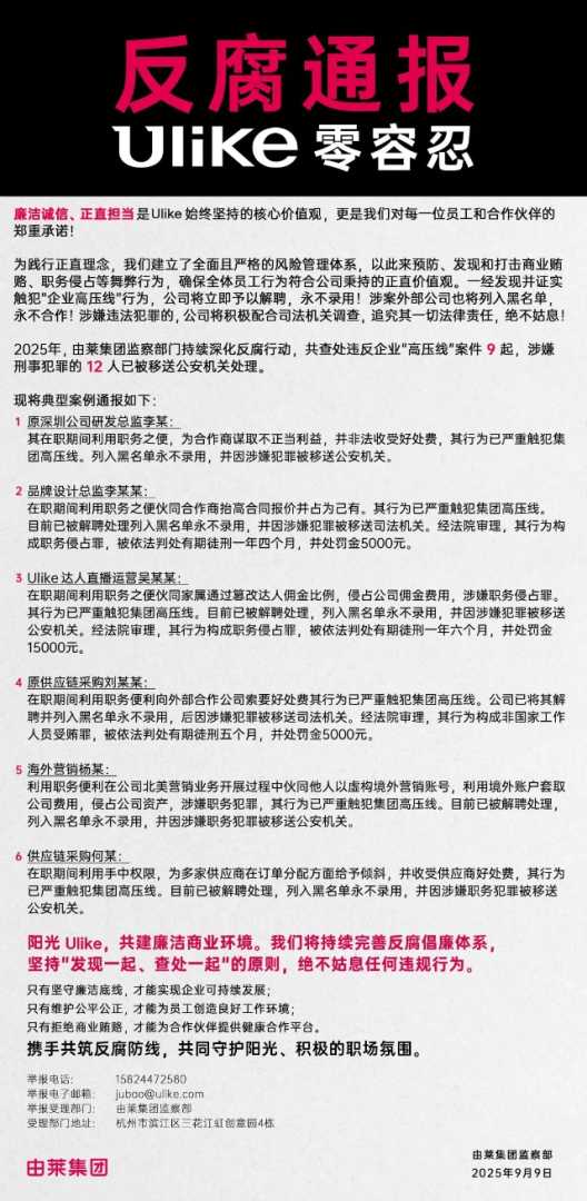 近日,知名品牌Ulike首次向社会公开其内部反腐成果,2024年至2025年度,Ulike查处违反企业“高压线”案件9起,涉嫌刑事犯罪的12人已被移送公安机关处理。此次反腐行动覆盖了研发、供应链、达人直播、海外营销、品牌设计等多个关键业务领域,彰显了企业反腐决心。
