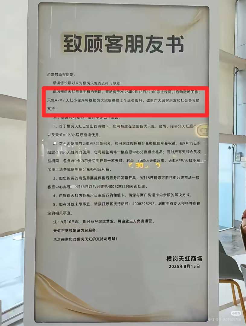 近日,一则深圳横岗天虹商场将于9月15日闭店的消息备受关注,引发零售业转型热议。横岗天虹自2010年底开业,曾是龙岗区域的“人气地标”,陪伴居民近15年,如今悄然谢幕,成为传统百货商超“退潮”的又一缩影。这一事件不仅反映了零售业变革趋势,也折射出传统商超在电商冲击下的转型压力。