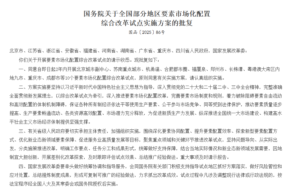 国务院批复要素市场化配置改革试点,助力全国统一大市场建设