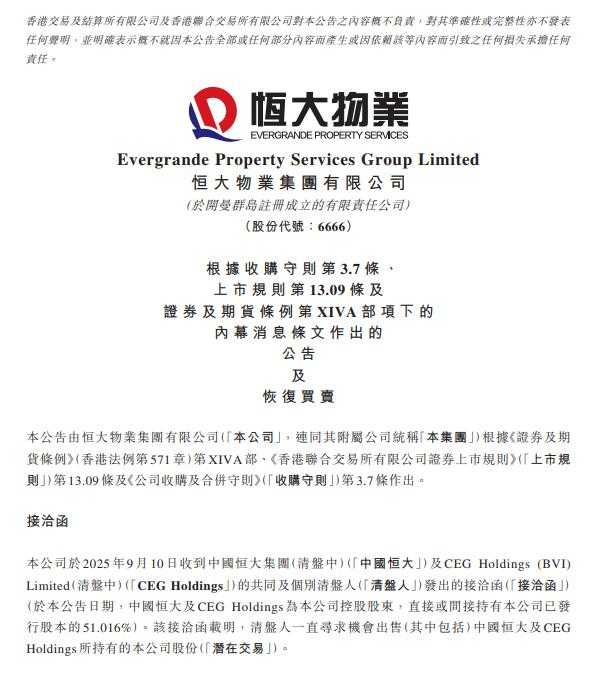 恒大物业港交所公告,2025年9月10日收到清盘人接洽函,清盘人寻求出售所持股份,已与有意方订保密协议,收到指示性要约,拟11月邀有意方提交最终建议书,公司已申请恢复股份买卖。