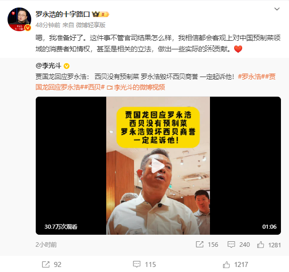 而罗永浩则在微博回应,表示自己已经准备好了应对诉讼。回溯来看,9月10日,罗永浩通过社交平台发文称:“好久没吃西贝了,今天下飞机跟同事吃了一顿,发现几乎全都是预制菜,还那么贵,实在是太恶心了。”他同时呼吁,希望国家尽早推动立法,强制饭馆注明是否用了预制菜。此事持续发酵,引发网友热议。有网友表示,西贝很适合孩子吃,但听说很多是预制菜,对此表示疑虑。