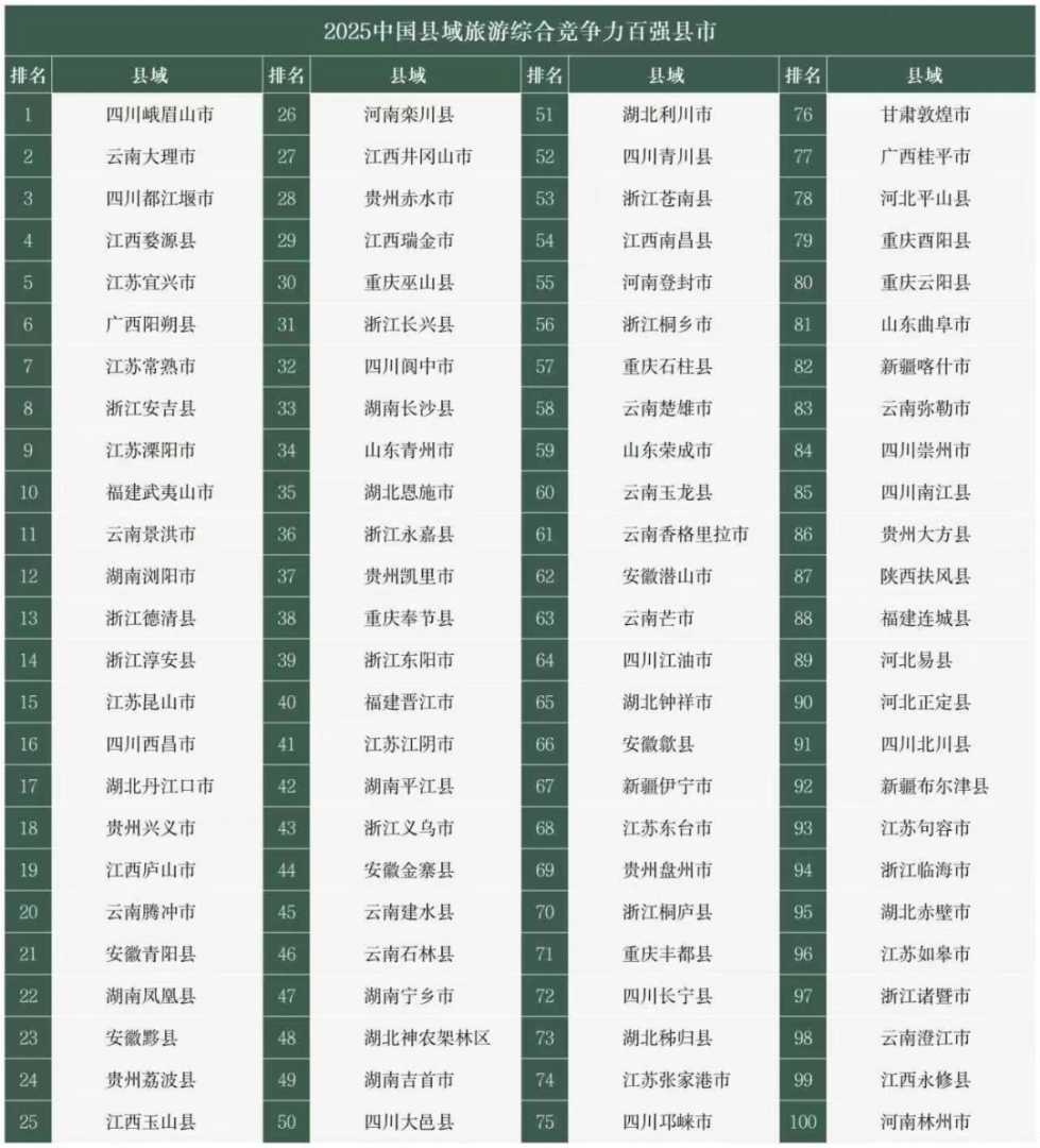 近日,竞争力智库、北京中新城市规划设计研究院等机构联合发布《中国县域旅游竞争力报告2025》,揭晓2025中国县域旅游综合竞争力百强县市等榜单。报告显示,2025中国旅游百强县呈现旅游经济稳步增长、对区域经济拉动作用持续增强、旅游品质与保障体系协同强化升级等特征。“东浙江,西云川”格局凸显。
