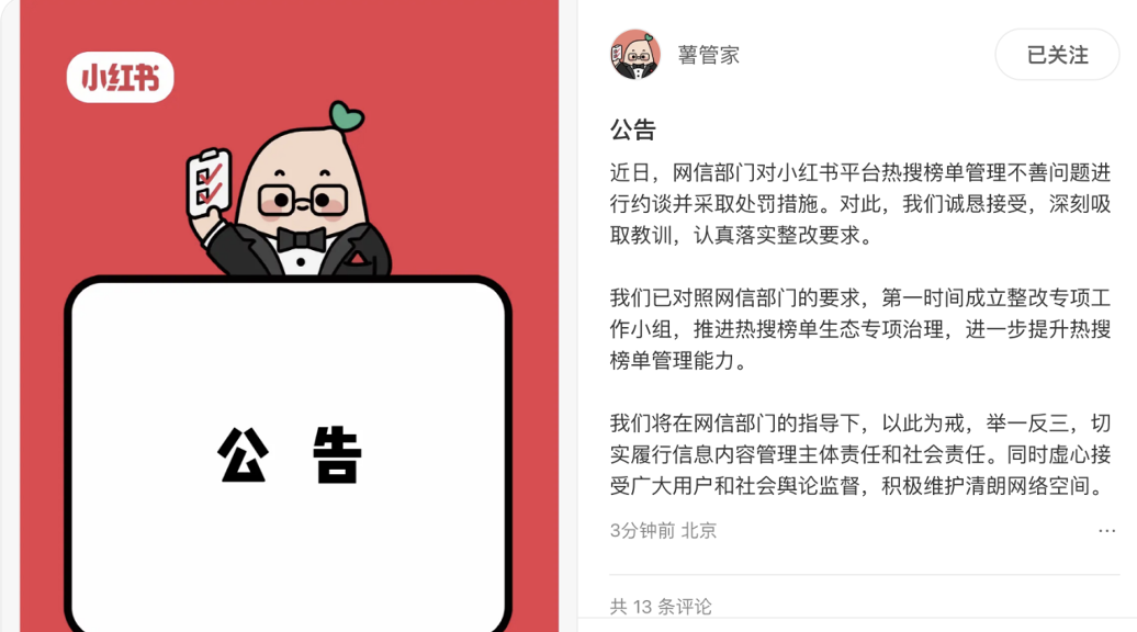 小红书因热搜榜单管理问题接受网信部门处罚并整改