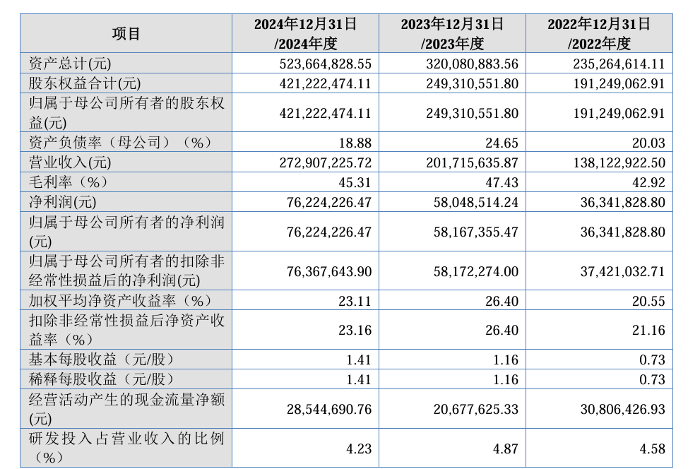 2022年至2024年(下称“报告期”),弥富科技分别实现营收1.38亿元、2.02亿元、2.73亿元;归母净利润为3634.18万元、5816.74万元、7622.42万元,同比上涨46.04%、35.29%,主要系关键零部件产品收入增长。汽车零部件行业持续增长,为企业发展提供了良好环境。