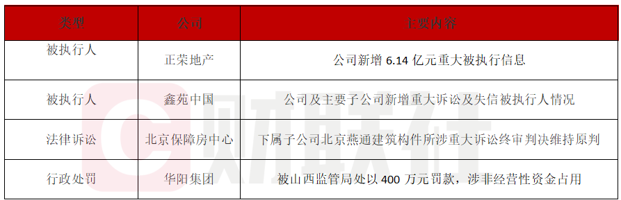 正荣地产控股新增6.14亿元被执行信息,鑫苑中国及子公司新增重大诉讼与失信被执行人情况,北京保障房中心子公司诉讼终审判决,华阳集团被罚款,涉及资金占用等问题,各企业财务状况与风险受关注。
